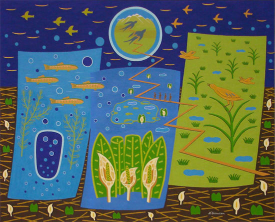 | 「水芭蕉・鳥・水玉の湿原」 清水 直史郎 |